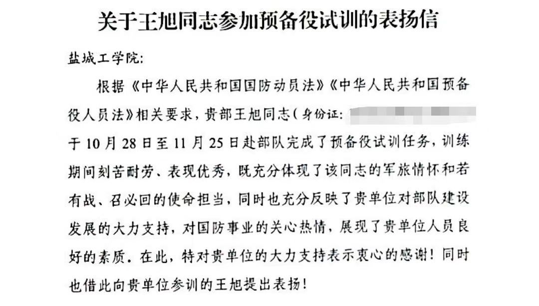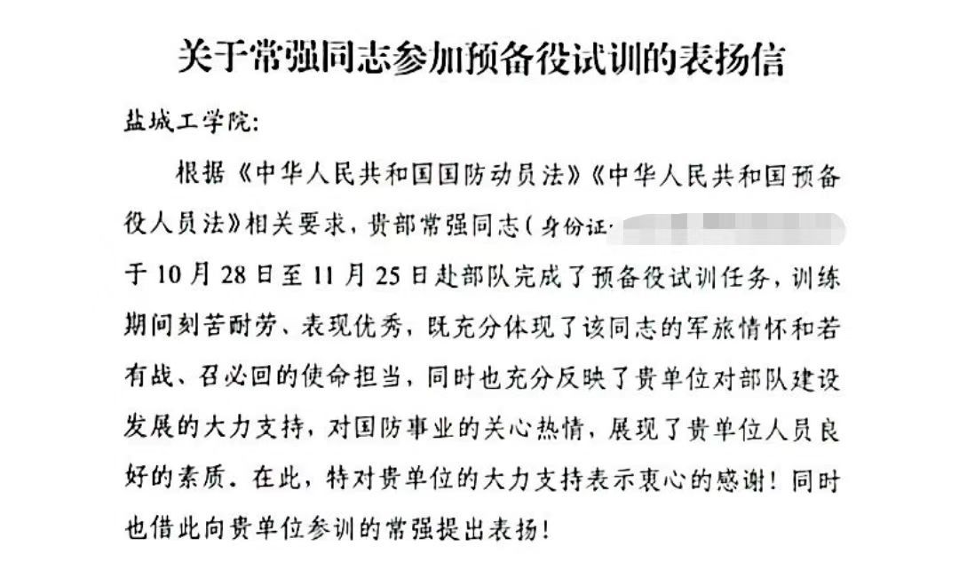 12月3日,公司收到中国人民解放军某部表扬信,Z汽车222班王旭、Z汽车223常强在接受部队召回期间出色完成预备役试训任务,受到部队通报表扬。学院号召全体同学们以他们为榜样,刻苦学习,勇于担当,努力提升综合素质,积极投身国防建设和社会主义现代化建设,为实现中华民族伟大复兴的中国梦贡献自己的力量。