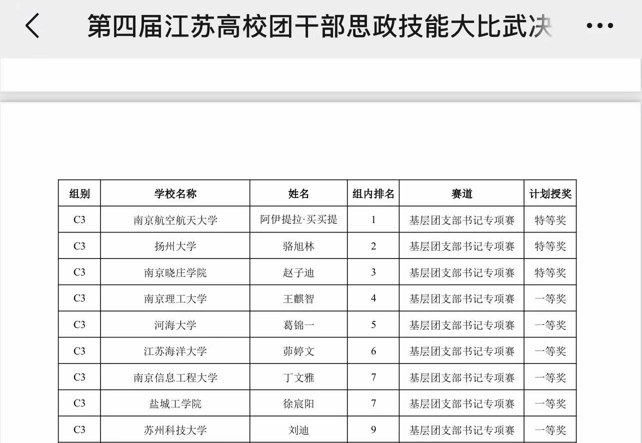 9月29日,第四届江苏高校百校万名团干部思政技能大比武决赛顺利结束,公司徐宸阳同学荣获基层团支部书记专项赛等奖。这是公司在此赛事中取得的最好成绩,也是首次有公司学子入围决赛。
