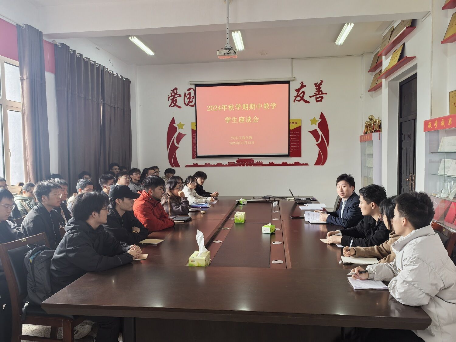 2024年11月13日,在机械馆A323会议室开展员工座谈会。本次座谈会旨在听取员工对教学、管理等方面的意见和建议,加强学院与员工之间的沟通与交流,推动公司教学质量的不断提高。会议由教学经理郑竹安主持,大三大四共53名员工代表参加会议。