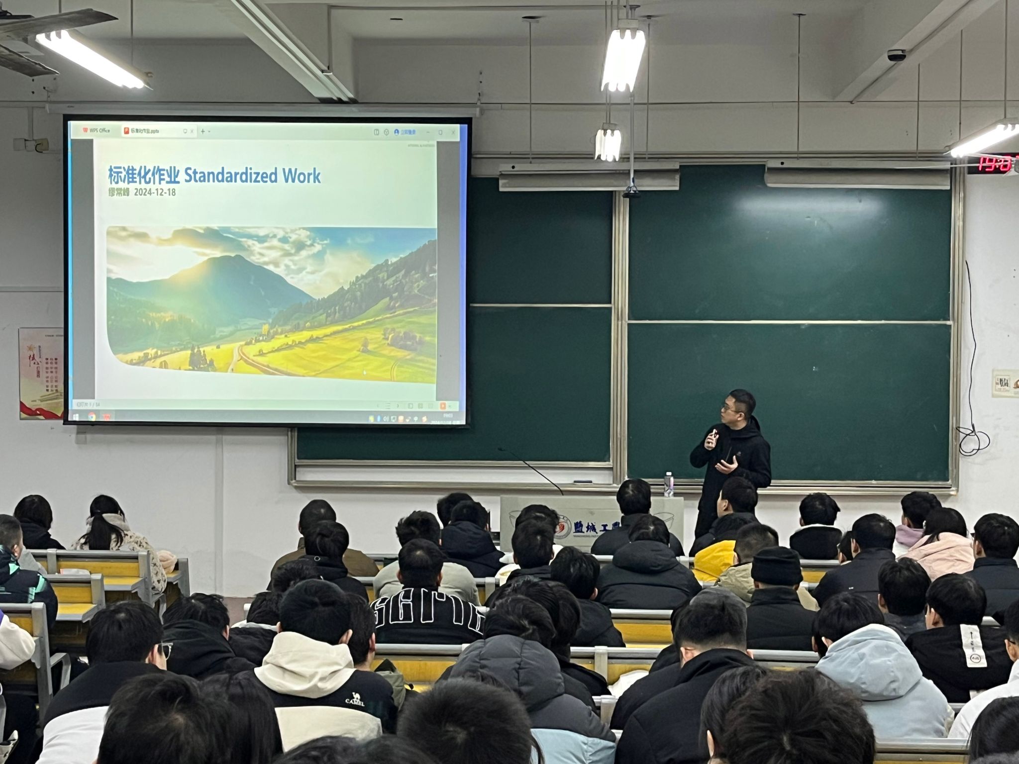 推进产教融合是应用型高等院校提高人才培养质量的重要方向,为进一步深化产教融合,提升校企合作的力度和广度,促进人才培养质量的提高,12月18日晚,学院邀请佛吉亚盐城汽车部件系统有限公司制造部经理缪常峰,在博学楼D113为员工讲授标准化作业的实践知识。