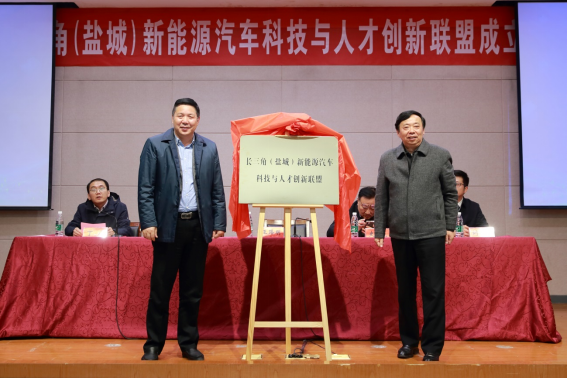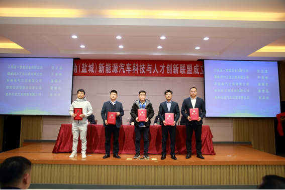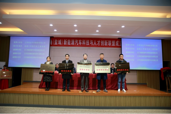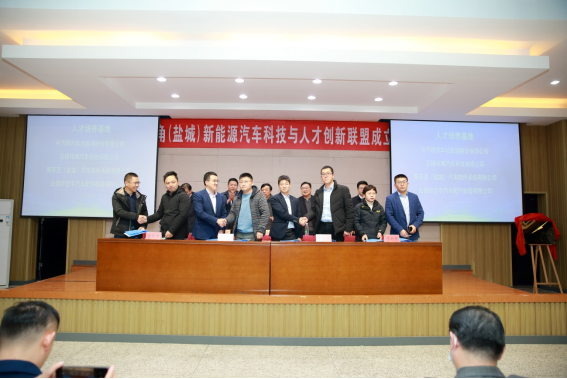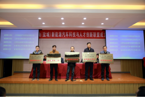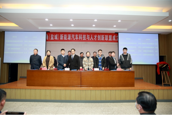 王路明和邓既明共同为长三角(盐城)新能源汽车科技与人才创新联盟揭牌。主席台嘉宾向理事长单位、秘书长单位和8家副理事长单位授牌,向5名联盟产业教授颁发聘书。8家成员单位与公司现场签约了4项产学研合作项目和4项人才培养项目。