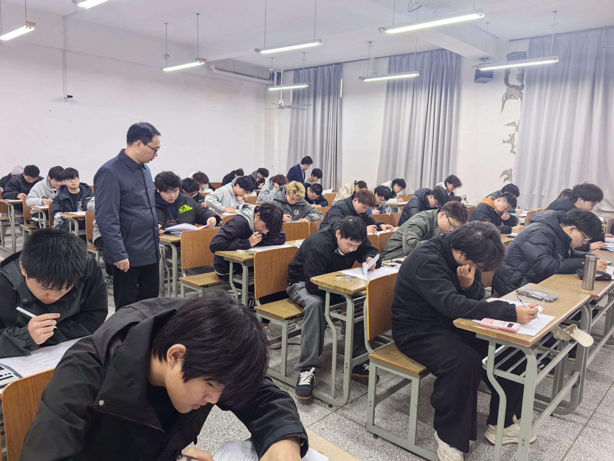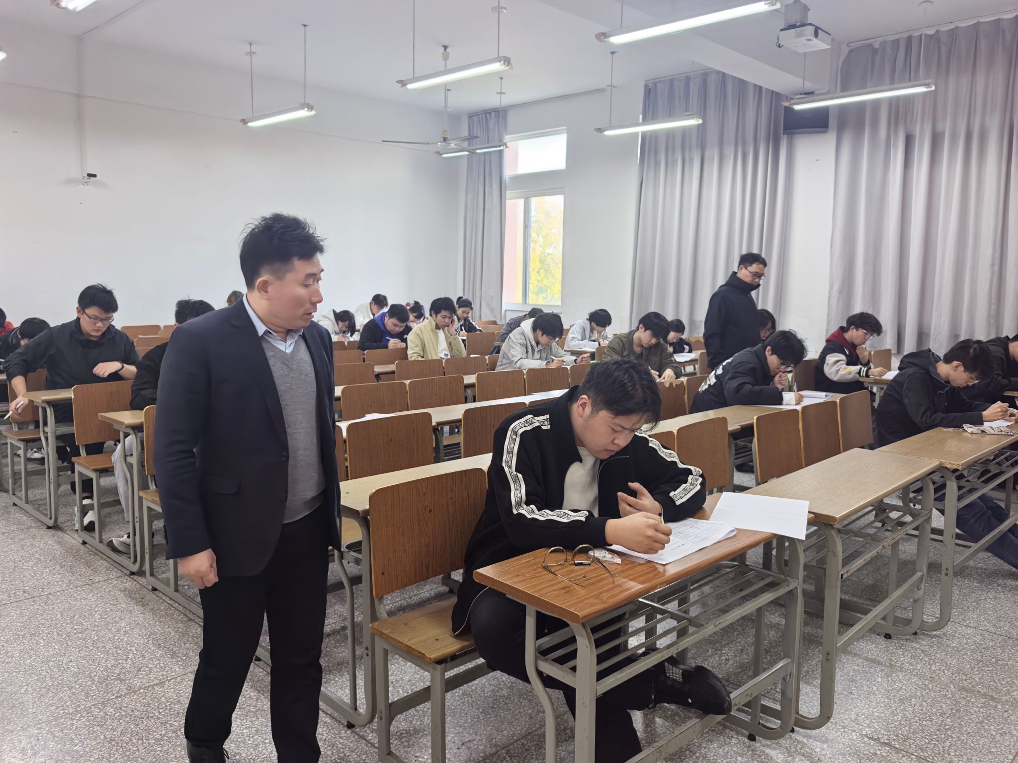 巡考期间,院领导逐一走进各考场,仔细查看考场布置、监考履职及考生状态,重点检查手机等电子设备管理、试卷分发回收等环节。整个考试过程规范有序,监考教师严格履职,维护考场秩序;考生们自觉遵守考试纪律,自觉将手机统一上交至指定位置,专注答题,展现出严谨自律的求学态度与诚信应考的良好风貌。这种良好的考试氛围,充分体现了学经理期以来狠抓考风考纪的显著成效。