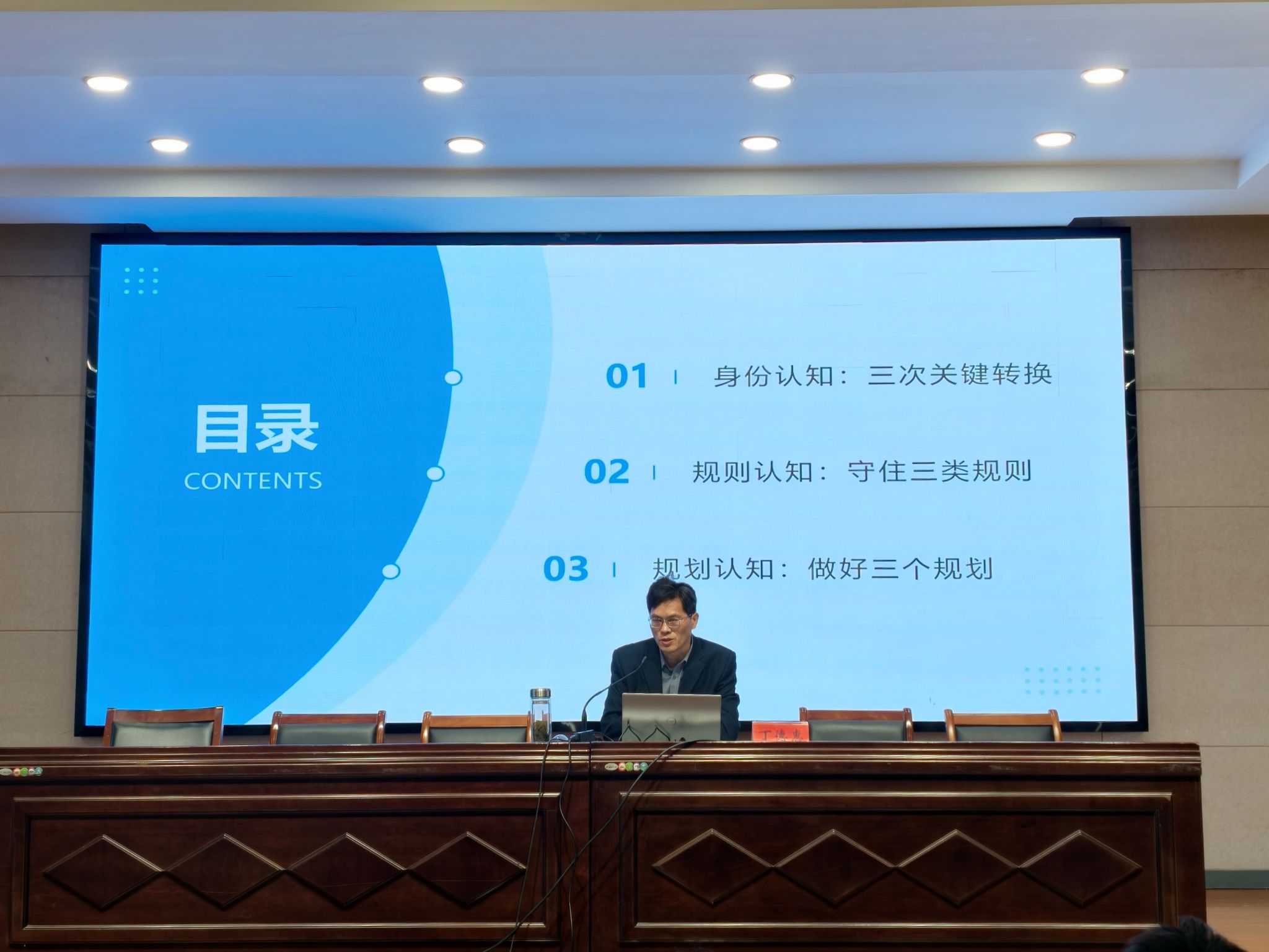 讲座中,丁德惠结合“上大学的意义”这一核心问题,引导新生跳出“只为毕业证、学位证”的单一认知,实现从“知识积累”到“完整人格塑造”的跨越。丁德惠首先阐释了身份认知的内涵,重点讲解了大学新生如何完成从“中员工”到“老员工”,找准“老员工”身份,再从“老员工”到“准社会人”的三次关键“身份迭代”;解读了规则认知的定义与重要性,强调作为大学新生,认识并遵守不同层面的规则,是适应校园、规避风险、少走弯路的重要保障,帮助新生“安全前行”;详细讲述了规划认知的核心内涵,明确提出新生需做好大学四年规划、未来就业升学规划、未来人生定位规划三大规划,引导新生从行业趋势、社会需求、个人兴趣三个方面找准自身定位,将个人成长与行业、社会需求紧密结合。