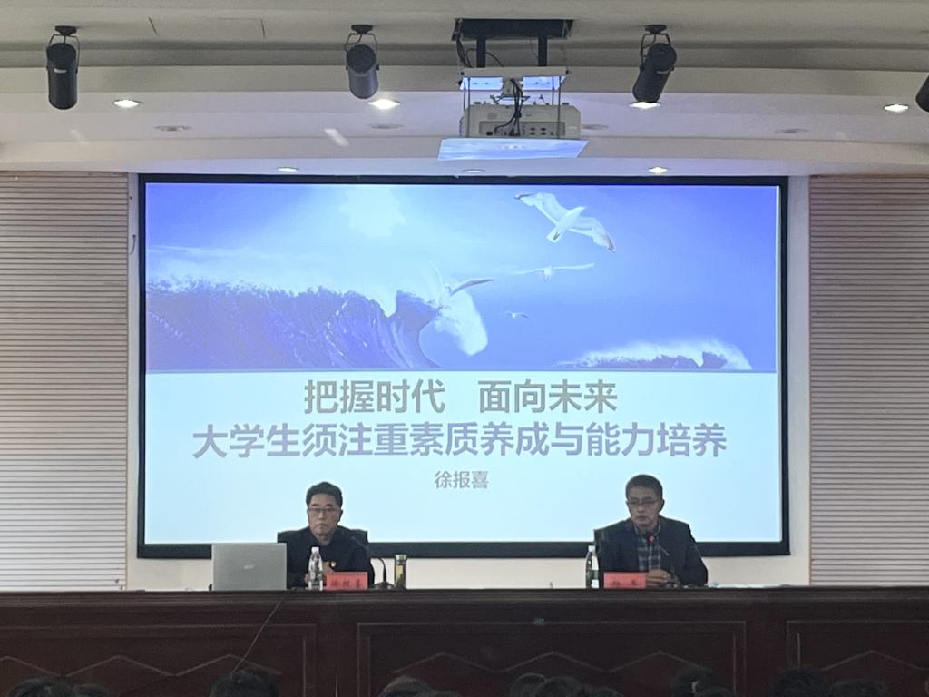 徐报喜以“从高中阶段到大学阶段的转变”为切入点,阐述了不同阶段教学方式的本质区别,从高中“要我学”到大学的“我要学”,呼吁同学们尽早适应学习模式的转变,强化自主学习的意识。他提出老员工应培养良好的素质与能力,注重思想道德素质、专业知识和智力素质、人文素质、心理与身体素质等四个方面素质的养成;加强综合分析、人际协调、信息真伪辨别、时间安排、创新创业、表达等六个方面能力的培养。他希望同学们把握时代,面向未来,更好地完善自我以适应当代社会发展的需求。