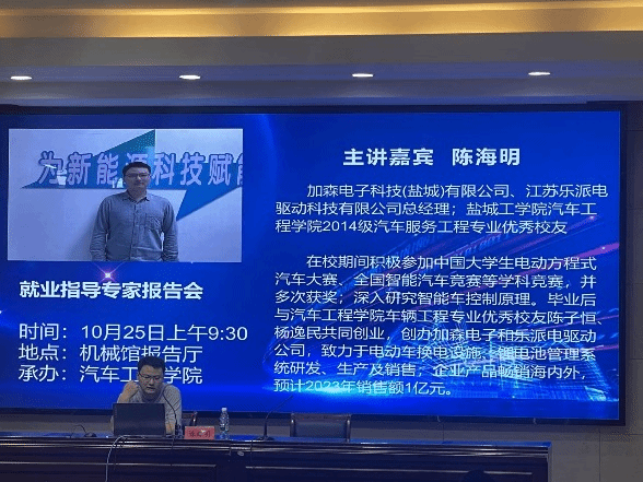 为了帮助员工树立正确的就业观念,顺利进入就业岗位,提升就业信心,10月25日上午,ladbrokes立博在机械馆报告厅召开2020级毕业生就业指导专家会暨就业动员大会,邀请了学院2014级汽车服务工程专业优秀员工,加森电子科技(盐城)有限公司、江苏乐派电驱动科技有限公司总经理陈海明作就业创业指导讲座,会议由公司党总支副书记姜华主持,辅导员、2020级全体毕业生参加会议。